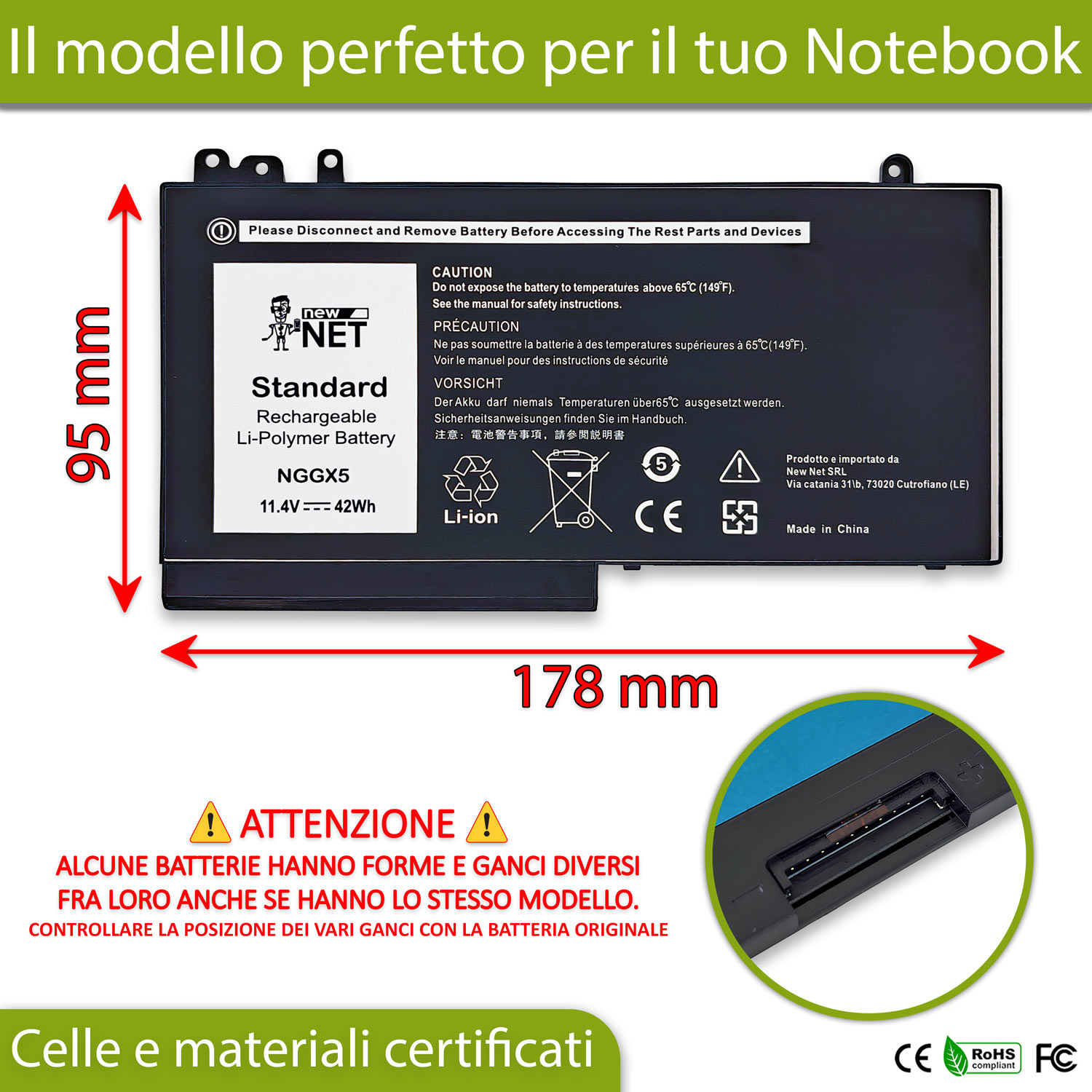 Garantiamo le nostre batterie grazie alle celle di ottima qualità con le quali sono costruite, ciò assicura un’altissima durabilità grazie anche al design costruttivo privo di difetti. Ti preghiamo di controllare la scheda delle compatibilità che si trova al centro della descrizione e di confrontare le caratteristiche e il range della tua batteria con quelle dichiarate.