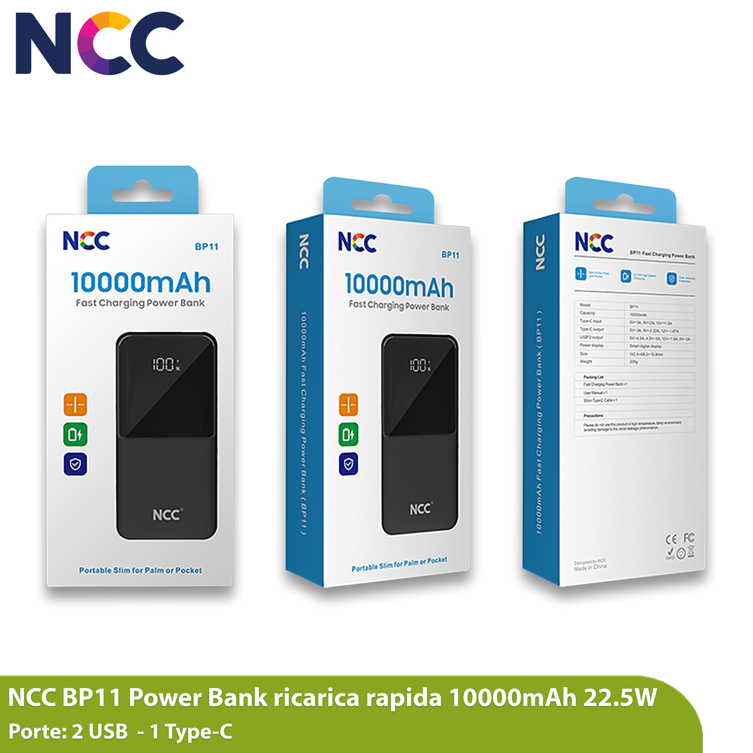 Powerbank Power Bank 10000mAh fast charging, 22.5W, con display, 3 porte, 1 porta type-c, 2 porte USB-A